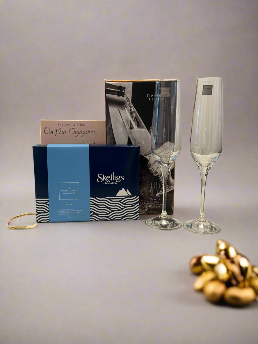 The Forever Starts Here gifting collection celebrates the romance of the lucky couple with our carefully chosen engagement gift. Includes two Tipperary crystal champagne flutes, a box of decadent skelligs chocolates, and a heartfelt card.