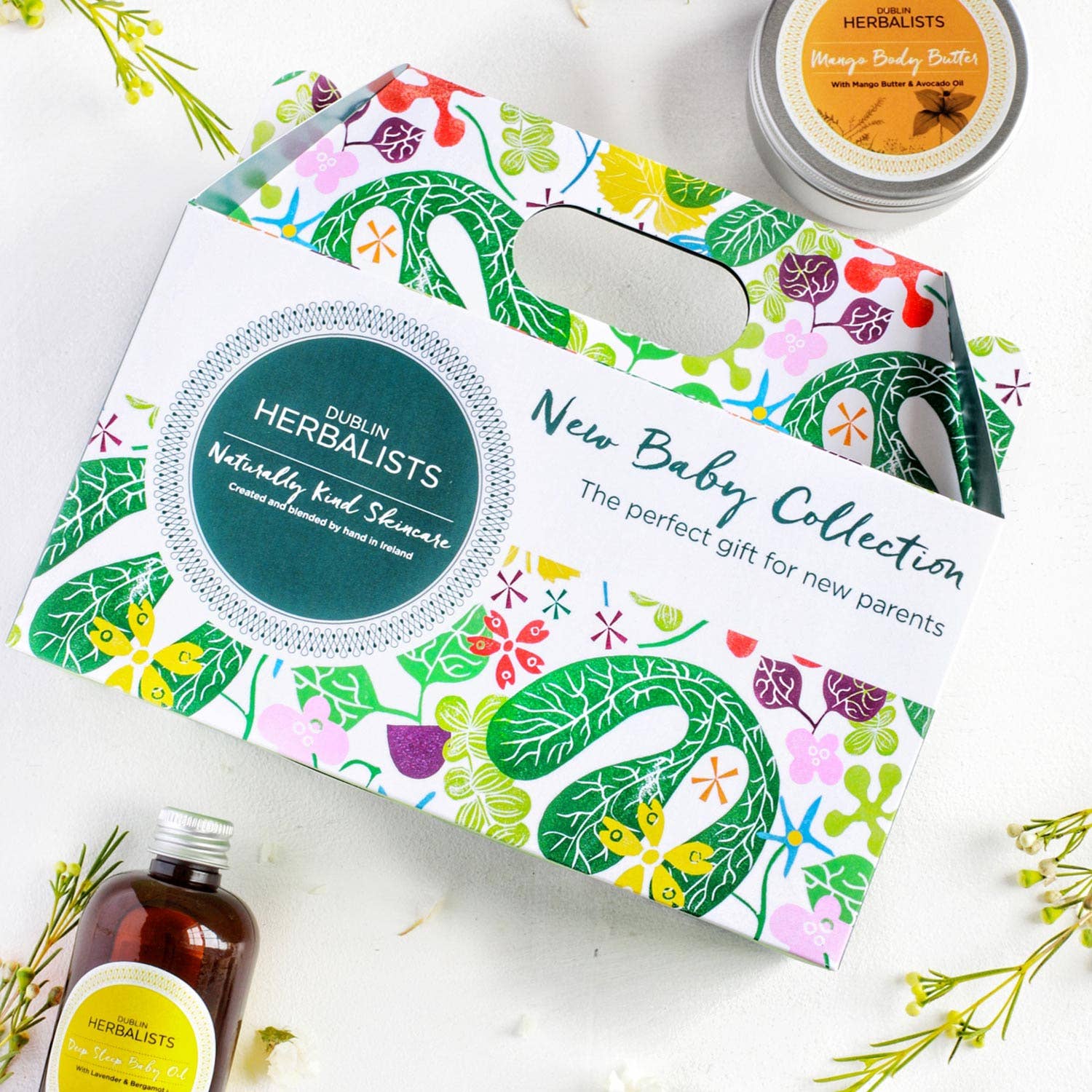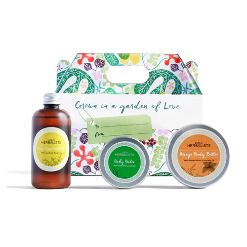 The perfect gift for any new parent, the Dublin Herbalists New Baby Collection includes their Baby Oil and Baby Balm for baby and Mango Body Butter for Mum or Dad. This is a vegan product.